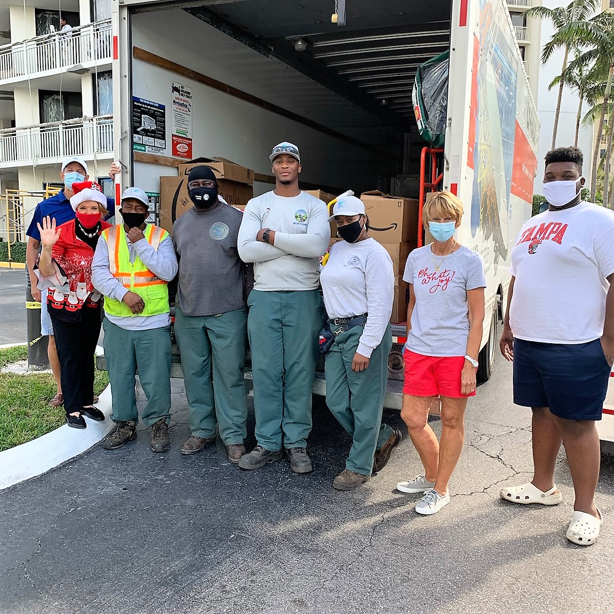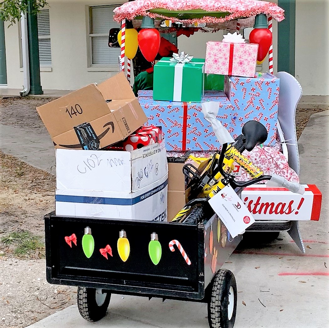 One team ordered, organized, stored, and wrapped 360 gifts, and another team guided the items down from the Secret Santas of Tiara’s location to a rented 26-foot truck for delivery to Azure Estates! From there, Santa and his elves delivered the gifts to each apartment in a “sleigh”!